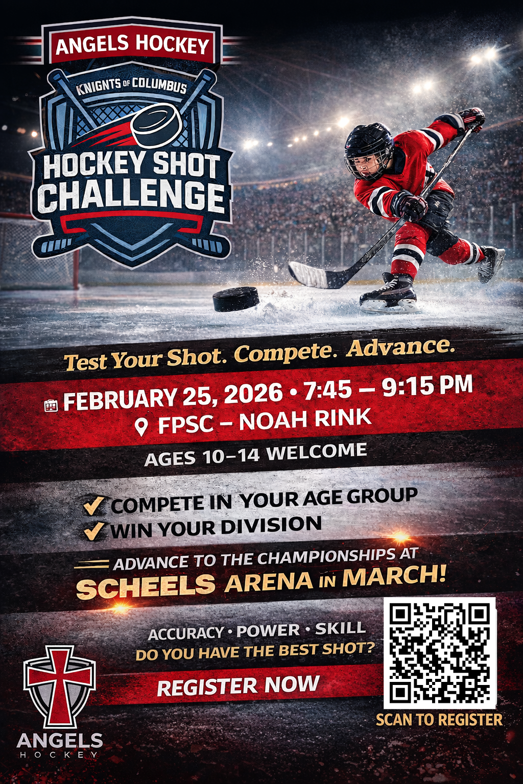 This is a preliminary event for Angels players only. Winners for each age and gender will be selected from this preliminary event to be a finalist in the Knights of Columbus "Hockey Shot Challenge" Championships held at the Scheels Arena in Fargo, ND on March 26-27, 2026.
